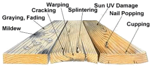 The damaging effects of weather on unprotected wood begin immediately. Rain, morning dew, and even melting snow are quickly absorbed by the unprotected wood, causing it to swell and soften. The sun’s heat causes drying, this makes the wood shrink. These cycles of wet and dry, swelling and shrinking, cause wood to warp, split, crack, and check. This causes wood to have a shorter life span, needing expensive repairs, or replacement.